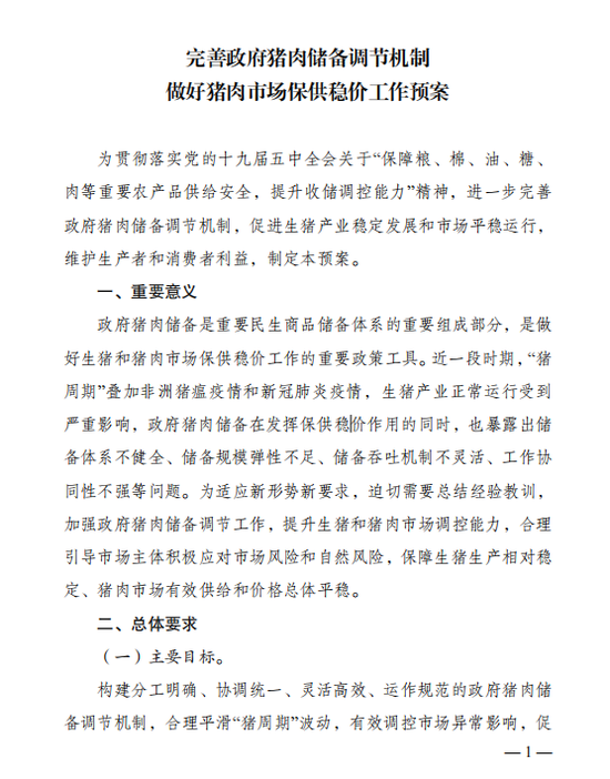 党的十九届五中全会通过的《中共中央关于制定国民经济和社会发展第十四个五年规划和二0三五年远景目标的建议》明确提出“保障粮、棉、油、糖、肉等重要农产品供给安全,提升收储调控能力”。为更好适应生猪市场的新形势新变化和满足人民群众的美好生活新期待,国家发展改革委会同有关部门认真研究,将本轮政府猪肉储备调节中的经验做法机制化、制度化,制定出台了本《预案》。